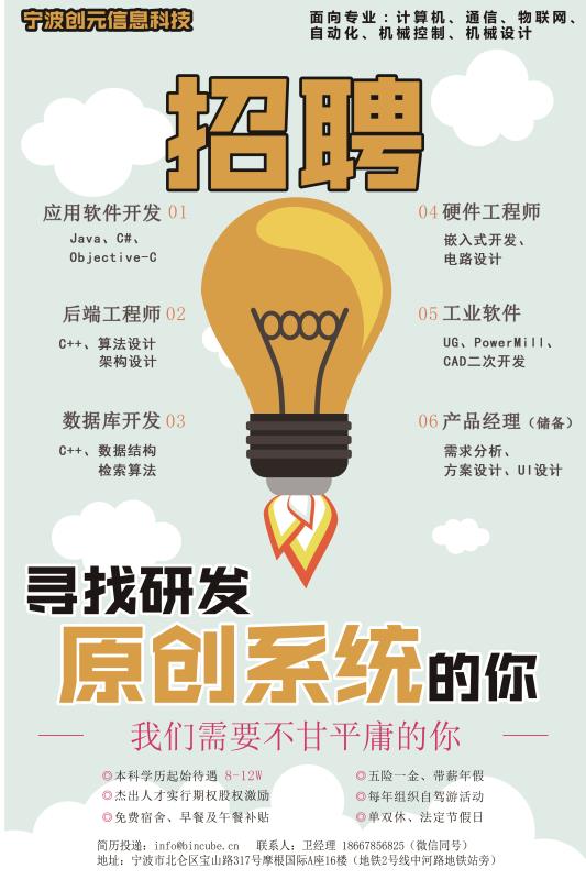 计算机学院专场招聘会 招聘时间:2019年11月6日 19:00-21:00 招聘地点:重行楼4楼会议室 请2020届毕业生准备简历积极参加招聘 公司简介: 创元信息由一批高层次德国海归团队创立,这是一家立足工业互联网领域,为制造业企业提供工业操作系统及工业APP开发的高科技公司。随着工业数字化浪潮的蓬勃兴起,创元信息的业务进入快速发展阶段,急需大量青年才俊加入,与公司一同奋斗成长。公司位于浙江省宁波市,地处长三角核心区,毗邻世界第一大港,地理环境得天独厚。 公司待遇: 本科学历起始薪资8-12w;五险一金等待遇 招聘岗位: 应用开发工程师(Java、C#、0b jective-C),后端工程师(C++、算法设计、架构设计),数据库开发(C++、数据结构、检索算法),硬件工程师(嵌入式开发、电路设计),工业软件开发工程师(UG、PowerMill、CAD二次开发)、产品经理(需求分析、方案设计、UI设计)等。 投递简历方式: 可编辑短信:姓名+意向岗位+学院,发送至:13383761115(胡女士), 通过短信报名可以优先在会场进行面试噢。