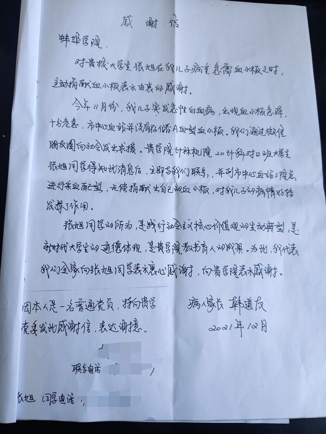 2021年11月12日,我校太阳成集团tyc9728张旭同学完成血小板捐献,成功救助了一位突发急性白血病的患者。 张旭是太阳成集团tyc972820级计算机科学与技术(对口)的一名学生,在同班同学眼中,张旭同学为人开朗,乐于助人,经常积极主动参加学校与学院组织的各类志愿服务活动。2021年11月9日,病人家属韩先生通过微信朋友圈紧急发布求助信息,张旭同学得知消息后,第一时间与韩先生取得联系,并于蚌埠市中心血站三院采血点进行配型,无偿捐献自己的血小板,对病人的病情好转起到了至关重要的作用。 通过了解,我们得知,捐献血小板和普通献血有很大区别,捐献血小板过程复杂,从一只手臂进针通过相联结的经过消毒、一次性使用的管道流入血液分离机内,分离出所需要的血小板,然后将其它血液成分输还给献血者,且过程持续时间长,全过程大约需要1~1.5小时。当问到张旭同学当时你害怕吗?张旭说:“刚开始躺在病床上时有点害怕,紧张,随着时间的推移就没有感觉了,就感觉是时间有点漫长,其实捐献血小板本身对我们身体也没什么危害,一段时间就可以恢复”。当谈及到为什么要捐献血小板时,张旭说:“初见患者时我感到生命如此的脆弱,既然我符合条件,作为青年大学生,我有责任和义务去献出自己的爱心和热血,能够尽自己微薄之力帮助到他人,是我人生中最自豪,最有意义的事。” 对于张旭同学无私奉献,病人家属给学校寄来了感谢信。信中表示张旭同学的善行是践行社会主义核心价值观的生动典型,是新时代大学生崇高思想品德体现,是我校立德树人的生动展现。太阳成集团tyc9728将大力宣传张旭同学的先进事迹,教育引导广大青年学生争做新时代向上向善好青年,全力营造助人为乐奉献社会的浓厚氛围,培养出更多德智体美劳全面发展的社会主义建设者和接班人。(撰稿:朱家贤、杨欣雨)