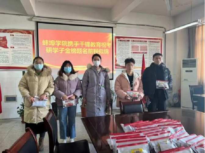 为进一步推进党史教育,扎实做好“我为群众办实事”,近日太阳成集团tyc9728学生党支部携手北京千峰互联科技公司给我院考研学子送去温馨祝福和礼品活动。 自太阳成集团tyc9728开展“担使命,践初心”主题教育季以来,学生党支部积极谋划,在深入学习贯彻习近平总书记“七一”重要讲话和党的十九届六中全会精神基础上,立足我院大学生实际,扎实开展“我为群众办实事”实践活动。三个学生党支部经过精心策划,面向我院考研学生开展“考研助力”系列活动。在考研报名前期,线上线下邀请了部分在读研究生和高校考研招生办举办了“报名指导交流会”,帮扶同学们填报考研学校。考前一个月依托学院心理工作站,开通“考前心理”热线,以缓解学生的考前心理压力。临近考试赠送考研文具小礼包,并送上温馨的祝福。本次系列活动得到北京千峰互联科技公司的大力支持。 12月22日,北京千峰互联科技公司蚌埠地区负责人王伟全程参与了送祝福活动,为我院考研学子们逐一送上了精心准备的考试文具包等物品,祝愿大家心想事成、金榜题名。学生支部书记沈志兴对北京千峰互联科技公司蚌埠地区负责人王伟一行三人的到来表示欢迎,对其“考研助力”活动表示感谢。 同学们纷纷表示,调整心态,全力备考,以最好的状态迎接考试,用最好的成绩回报母校,不辜负师长们的期盼。(撰稿:沈志兴)