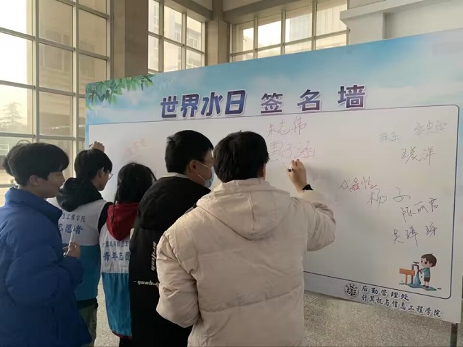 3月22日是第三十一届“世界水日”,3月22—28日是第三十六届“中国水周”。为唤起广大师生节水爱水、增强对水资源的保护意识,学校后勤管理处、太阳成集团tyc9728联合开展“节水爱水惜水护水,人与自然和谐共生”为主题的宣传活动。 围绕活动主题,各班级以PPT展示、交流讨论等多种班会形式,向同学们宣传水资源的分布、水资源的匮乏、水资源浪费及节水措施等方面内容。同时,利用宣传标语、宣传海报、学院公众号等,在教学楼、校园主干道、学生宿舍等场地进行宣传,进一步强调节水护水的重要性,扩大知晓率和覆盖面。 此外,青年志愿者们也积极引导大家节约用水、保护水资源,及时制止不节水行为。最后,志愿者们站成整齐的队伍进行了宣誓,并郑重地在签名墙上承诺签名,表达自己要用实际行动“善待”每一滴水。 滴水在指尖,节水在心田。通过本次活动,宣传了节水爱水惜水护水的重要性,营造了校园节水的良好氛围,增强了大家的节水意识,倡导全体师生自觉自愿行动起来,从节约每一滴水做起,为创建资源节约型、环境友好型社会贡献出自己的一份力量!(撰稿:王晨洋 编辑:常静静 审核:李丽)