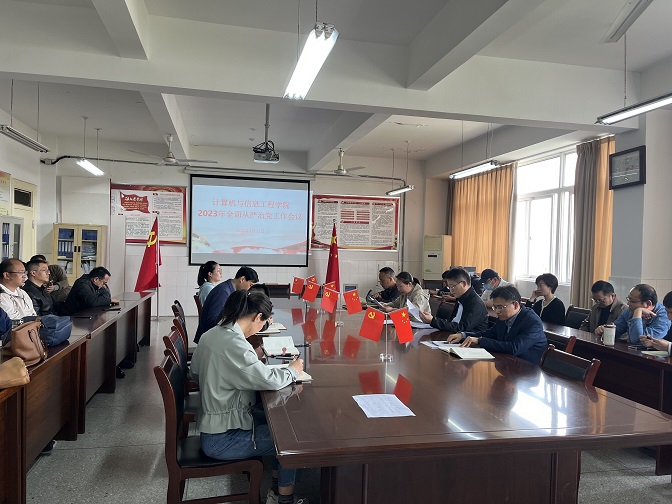 4月11日下午,计算机与信息工程学院在学院会议室召开2023年全面从严治党工作会议,传达学习省委教育工委和学校2023年全面从严治党工作会议精神,研究部署学院全面从严治党重点工作。会议由学院党委副书记、院长黄迎辉主持,全体教师参加会议。 会议首先开展廉政警示教育,学院党委副书记、纪委书记李丽通报了省内高校和学校2022年有关违法违纪案件情况,对廉洁自律提出要求。 学院党委书记李如林讲话。他总结了学院2022年全面从严治党工作,对2023年重点工作进行安排部署,一是强化政治建设,坚决贯彻落实中央、省委和学校党委的各项决策部署,组织开展好主题教育,切实增强“四个意识”、坚定“四个自信”、做到“两个维护”;二是深化理论武装,坚持不懈用习近平新时代中国特色社会主义思想凝心铸魂,将其转化为推动学院工作的强大力量;三是推进组织建设,加强“双创”推进力度,培育打造党建品牌,把学院党委和党支部建设成为坚强战斗堡垒;四是抓实作风和纪律建设,严格落实中央八项规定精神和学校具体要求,持之以恒正风肃纪;五是加强制度建设,全面梳理和健全完善学院规章制度,并严格按照各项政策和制度办事,做到公开透明、公平公正。 黄迎辉强调,全体教师要以实际行动落实学校和学院全面从严治党工作会议精神,把各项具体要求与自身工作紧密结合,推动全面从严治党工作取得实效,推进学院内涵式高质量发展。(撰稿:刘世军;编辑:常静静;审核:李如林)