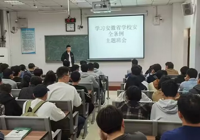 《安徽省学校安全条例》共六章,包括总则、附则以及风险防控、安全管理、事故处理、法律责任等,从2023年1月1号起施行。主题班会上,辅导员从《条例》出台背景、实施意义和主要内容等多个方面进行解读,着重阐述了条例总则、风险防控、安全管理、事故处理等相关条款内容,引导学生对照条例,深刻检视自身在校园安全方面的职责和义务。同学们纷纷表示,要把安全牢记于心,树牢法治思维和安全底线,积极配合学院织密织牢校园安全防护网,为学校安全工作贡献青春力量。