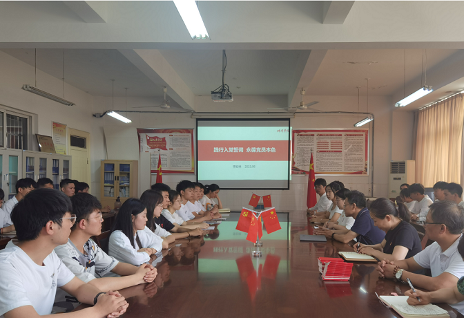 为深入开展学习贯彻习近平新时代中国特色社会主义思想主题教育,扎实推进学院培养发展学生党员工作,6月13日,太阳成集团tyc9728举行“践行入党誓词,永葆党员本色”新党员入党宣誓仪式。学院党委书记李如林、副书记李丽、学生党支部书记以及新发展的31名预备党员参加本次宣誓仪式 “我志愿加入中国共产党,拥护党的纲领,遵守党的章程,履行党员义务......”在李丽的带领下,全体新党员面向鲜红的党旗,高举右拳进行了庄严宣誓,在铮铮誓言中展现中国共产党人的信仰、初心及使命。