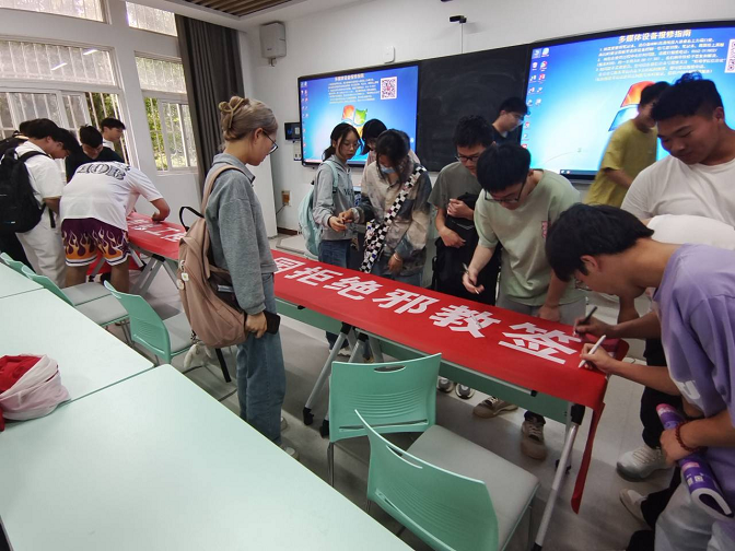 组织“对邪教说不”签名活动。我院学生在横幅上庄重签名,通过组织“反邪教”签名活动,学生们纷纷表示能够远离迷信,不听、不信、不传邪教,每一位学生都承诺在以身作则的同时,防止邪教危害身边的同学朋友,一旦身边出现此类案例,会采取坚决抵制、及时汇报等措施来遏制邪教,为维护校园长治久安作出自已的一份贡献。