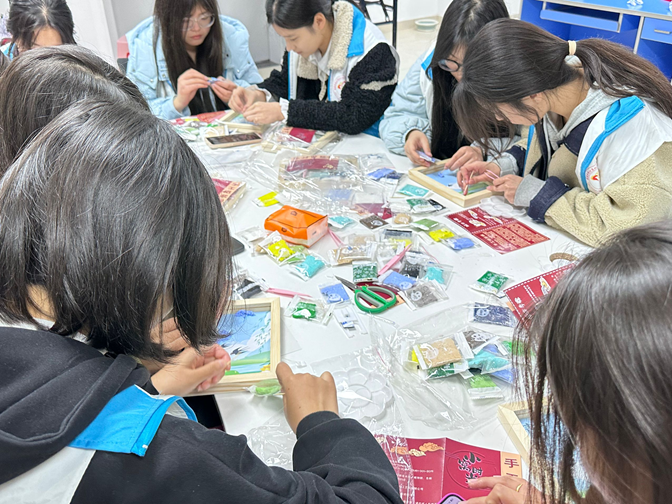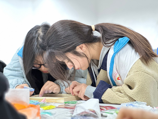 在学生活动室内,可以看到学生们或三五成群地讨论设计,或独自专注地涂抹纸浆,每个人都全神贯注于自己的作品。他们的手中,白色的纸浆逐渐被染上了春天的色彩,蓝色的天空、绿色的草地,一幅幅生动的画面跃然纸上。