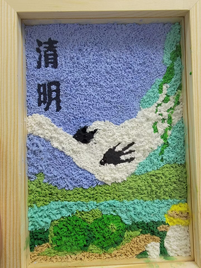 纸浆画,一种以纸浆为主要材料的艺术形式,因其质地轻盈、色彩鲜艳、易于塑形而受到师生们的喜爱。在这次活动中,学生们选择了清明节这一主题,将传统文化融入画作之中,既展现了节日的传统风俗,也寄托了对先人的缅怀之情。