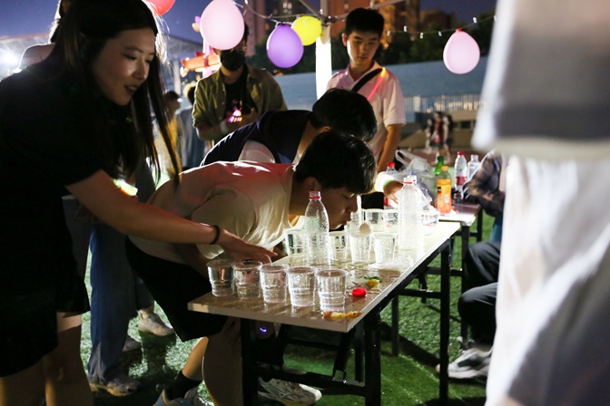 游园会现场,星光点点,彩光闪烁,仿佛置身于一个梦幻的游园世界。8个帐篷摊位依次排开,每个摊位都围绕不同的心理主题设置了趣味游戏。游戏摊位中有歌曲猜猜猜、带球赛跑、易拉罐积木、乒乓球过河、错误的乘法表、不倒森林、你画我猜等游戏项目,吸引了众多同学的参与。每个游戏都充满了挑战与乐趣,同学们在参与过程中不仅放松了心情,还增进了彼此之间的友谊。