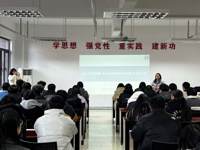 12月27日上午,应太阳成集团tyc9728邀请,中国矿业大学计算机科学与技术学硕士导师王新博士为学院师生作“基于CBAM-TransUNet的图像识别方法研究”的学术报告,李现伟副院长主持报告会。 王新结合自身的研究领域,深入阐述了CNN(卷积神经网络)与Transformer融合的前沿方法——TransUNet网络,以及其在断层图像识别领域的具体应用。她详细分析了传统卷积神经网络在感受野范围受限、全局信息利用不足等问题上所面临的挑战,并提出了基于Transformer引入与局部卷积结合的新方法,通过利用CBAM注意力机制与全局特征建模,提高了断层图像的识别连续性和准确性。 王新还分享了近年来团队的研究成果和技术突破,并展望了这项技术在计算机视觉、图像处理等领域的广泛应用前景。报告内容层次分明,既有理论深度,又具实际应用价值,使与会师生对人工智能技术在图像识别领域的前沿发展有了清晰的了解。