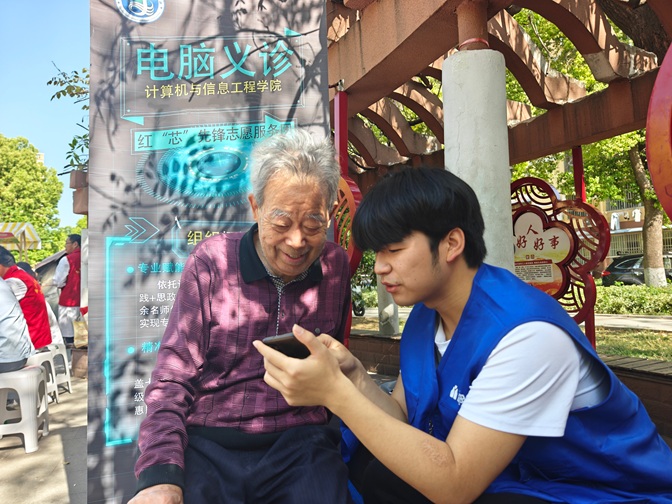 太阳成集团tyc9728定期组织红“芯”先锋志愿服务团的志愿者前往科苑社区,积极参与“邻距离·20集市”活动。活动现场,志愿者们充分发挥专业特长,为社区居民提供智能手机使用指导、电脑义诊等便民服务,以实际行动践行蚌院学子的专业素养和社会担当。志愿者们耐心地向老年人演示微信聊天、扫码支付、线上挂号等智能手机常用功能和使用方法,确保老人们能够理解并熟练操作智能手机,通过真实案例讲解防范网络诈骗技巧,提高居民的网络安全意识。另一边,“电脑义诊”服务点,志愿者们认真检测设备,排查系统故障,为居民解决各类电脑使用问题。红“芯”先锋志愿服务团专业细致的服务获得了社区居民的一致好评。
