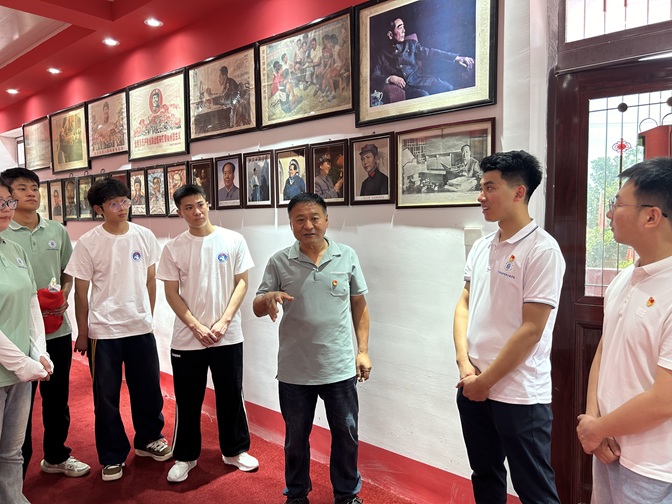 触摸百年红色脉搏。三层展馆内,陈列着新民主主义革命时期至社会主义建设时期的数百件文物,形态各异的毛主席像章,制作精良,每一枚都铭刻着特定历史时期的印记,见证了党领导下的伟大征程;泛黄的画报和地图,展现了不同时期的战略布局与发展脉络;栩栩如生的人物雕塑,生动再现了革命先辈们坚定的神情与无畏的姿态;还有老式时钟、瓷器茶壶等实物,从生活的细微之处折射出时代的变迁,让同学们深切感受到革命先辈们在艰苦环境中仍保持的乐观与坚韧。