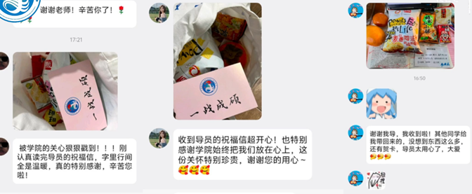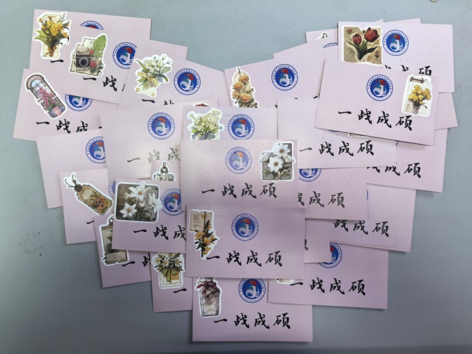 祝福卡片:小小卡片,承载着大大祝福。学院2026届毕业班辅导员为考研学生书写爱心祝福卡片,为他们加油鼓劲!一句句“一战成硕”“早日上岸”“考研加油”的寄语,承载着师长们的殷切期望。“收到导员的祝福信超开心,也特别感谢学院始终把我们放在心上,这份关怀特别珍贵,谢谢您的用心。”2022级物联网工程专业贾炜炜感动地说。