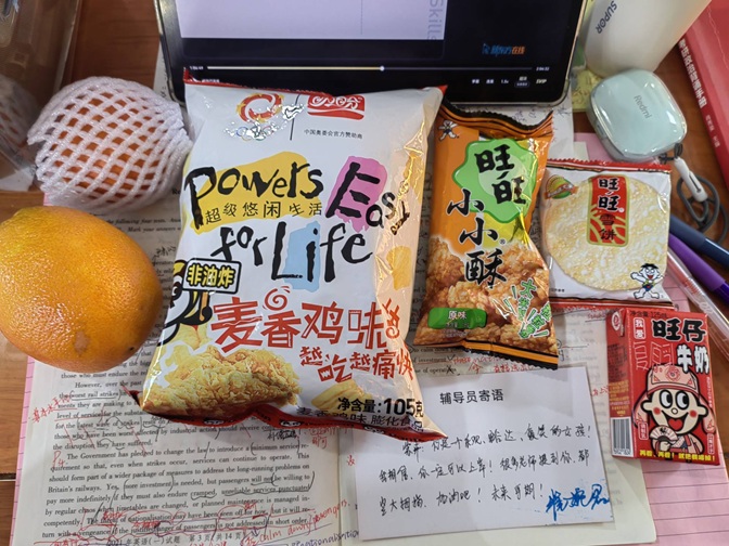 暖心礼包:细节传递温情,祝福化作力量。活动现场,学院领导、辅导员及教师代表为考研学子发放定制慰问礼包。礼包内含寓意“考试顺利”的旺旺礼品套装、心想“柿”“橙”的水果组合套装、承载学院殷殷期盼的“盼盼”牌小零食、镌刻“芯语心愿 一战成硕”的定制手提袋。一份礼包,十分心意,百分祝福,学院用爱心暖心为考研学子注入冬日暖流。